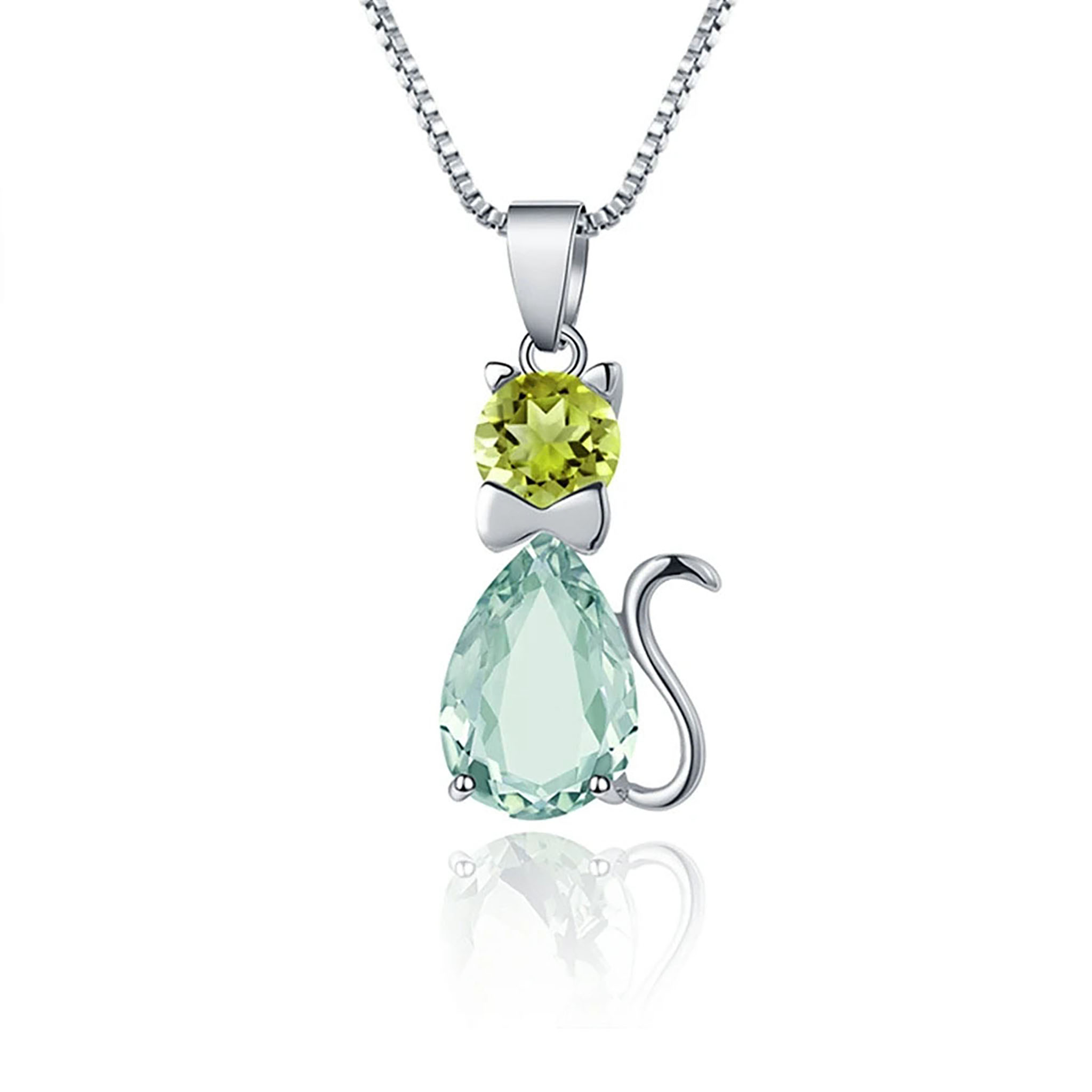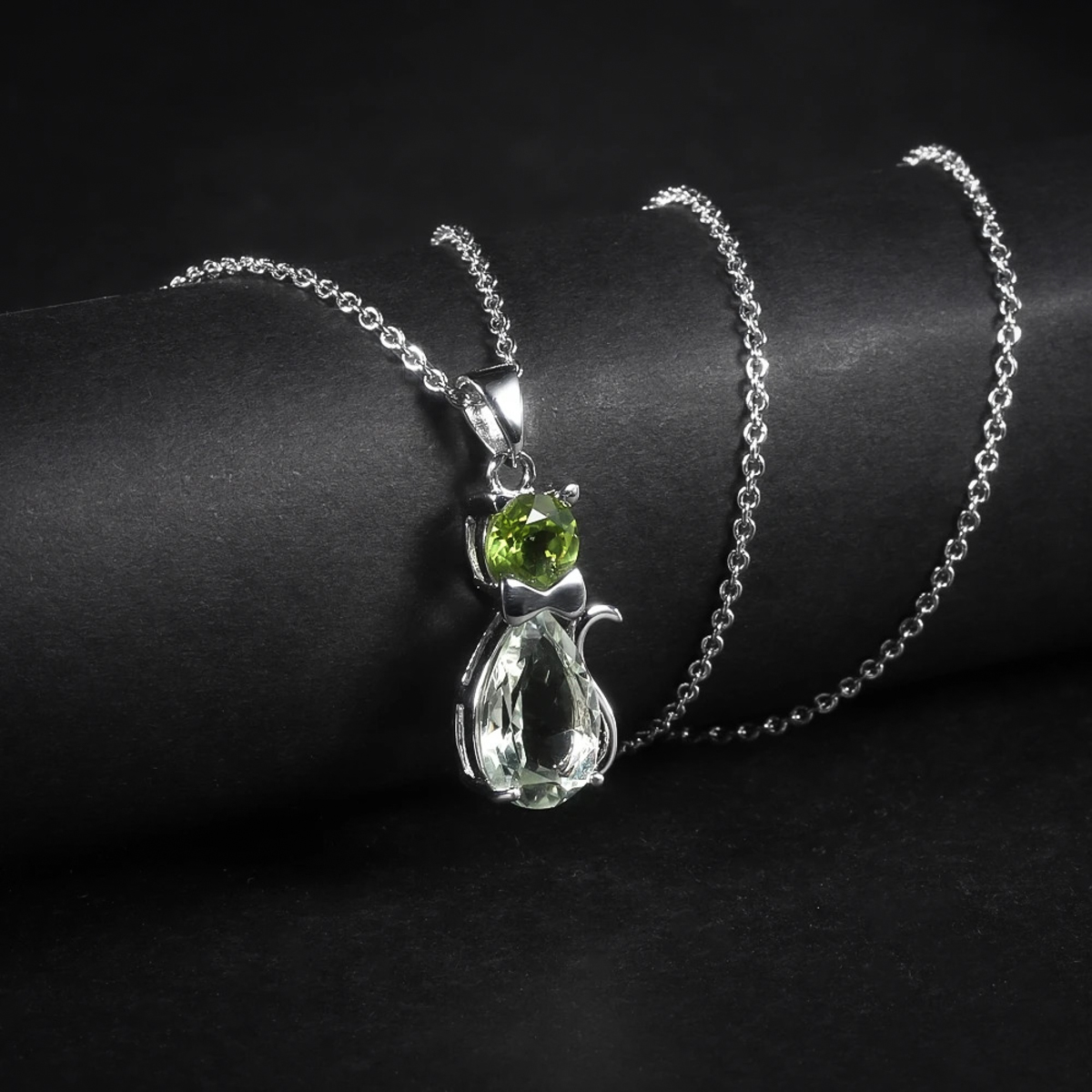 Make a playful statement with this Green Amethyst Peridot Cat Necklace. Crafted in 925 Sterling Silver, this pendant features a cat-shaped charm adorned with green amethyst and peridot gemstones. The whimsical design and vibrant colors make this necklace perfect for cat lovers or special occasions. Whether worn alone or layered with other necklaces, this cat pendant is sure to make a statement and spark conversations wherever you go. Treat yourself or someone special to this adorable necklace and celebrate the charm of feline companions in style.