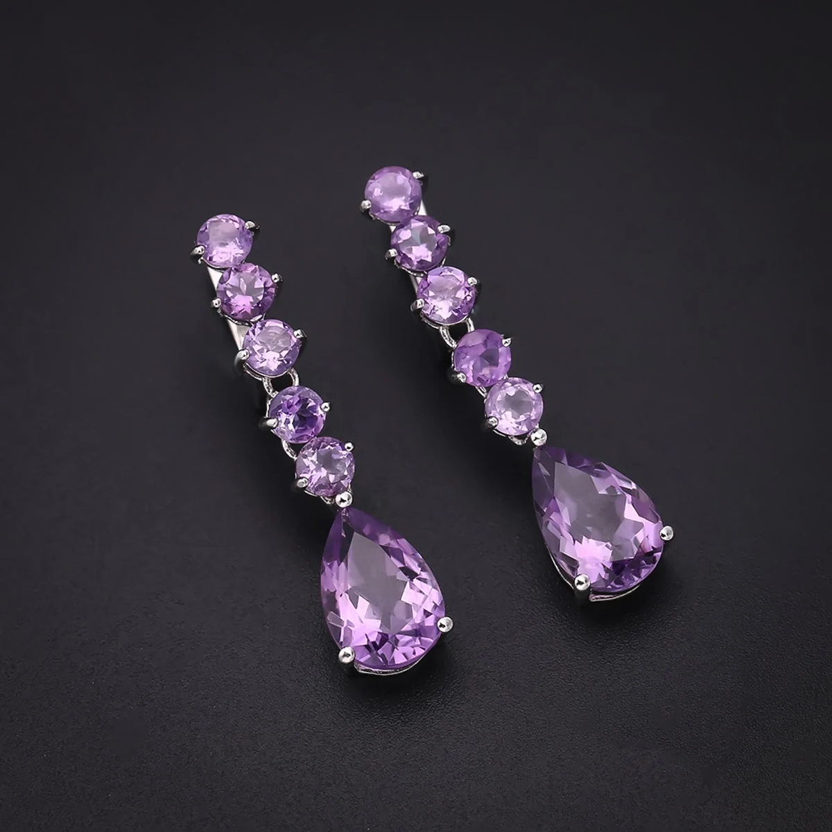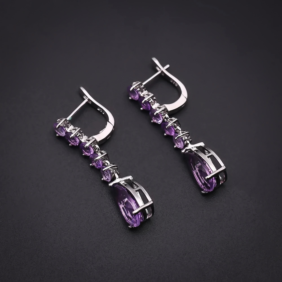 Add a touch of vintage glamour to your look with these Vintage Amethyst Drop Earrings. Crafted in 925 Sterling Silver, these earrings feature 8.91ct natural amethyst gemstones that dangle elegantly from hook closures. The rich purple hue of the amethyst stones adds a touch of sophistication to any ensemble, making these earrings perfect for both casual and formal occasions. Whether worn with a retro-inspired outfit or modern attire, these vintage earrings are sure to make a statement and turn heads wherever you go. Treat yourself or someone special to these exquisite earrings and embrace timeless elegance in style.
